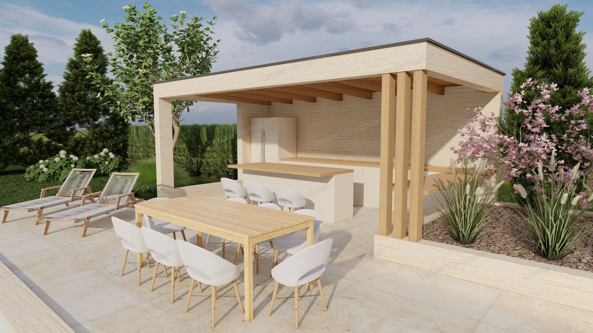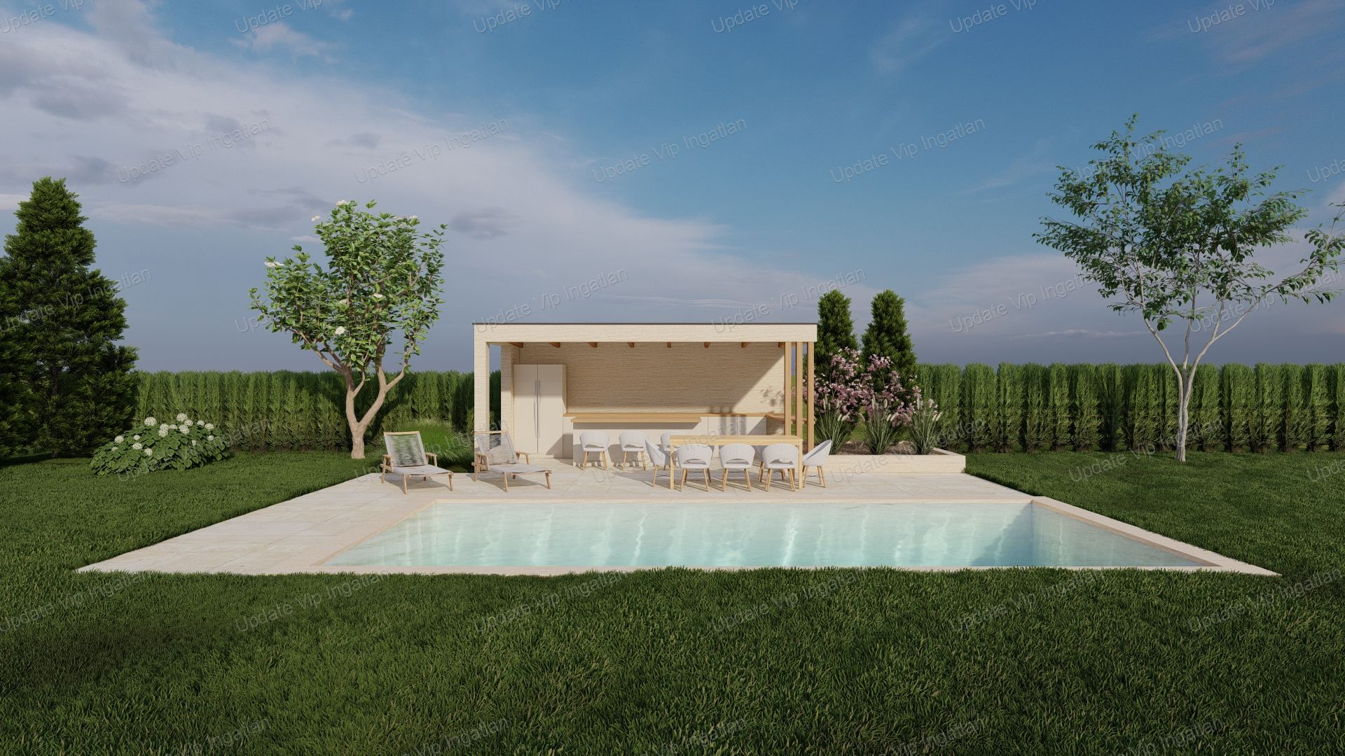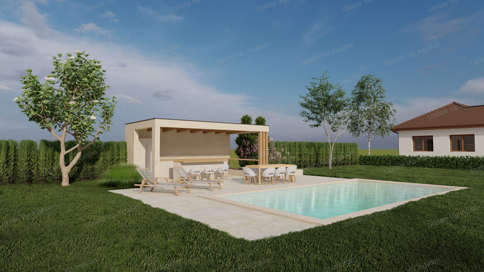 A látványterven szereplő kültéri medence és rekreációs tér kialakítása külön egyeztetés alapján indul