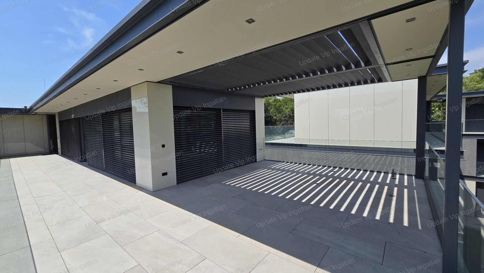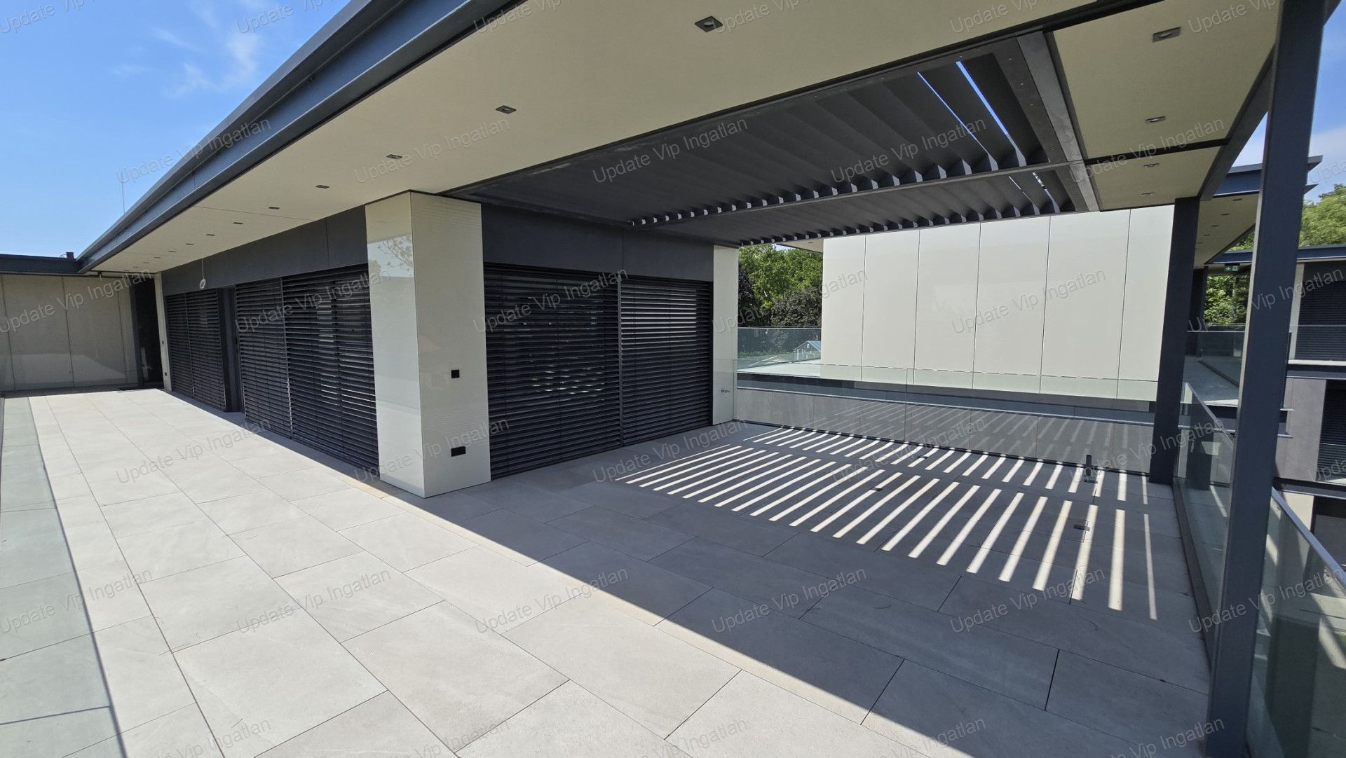 Kültéri teraszburkolat, egyedi modern megjelenésű, homlokzatburkolattal azonos megjelenésű és anyagú, rendszersaját, 2cm vtg. élcsiszolt kőporcelán lapok