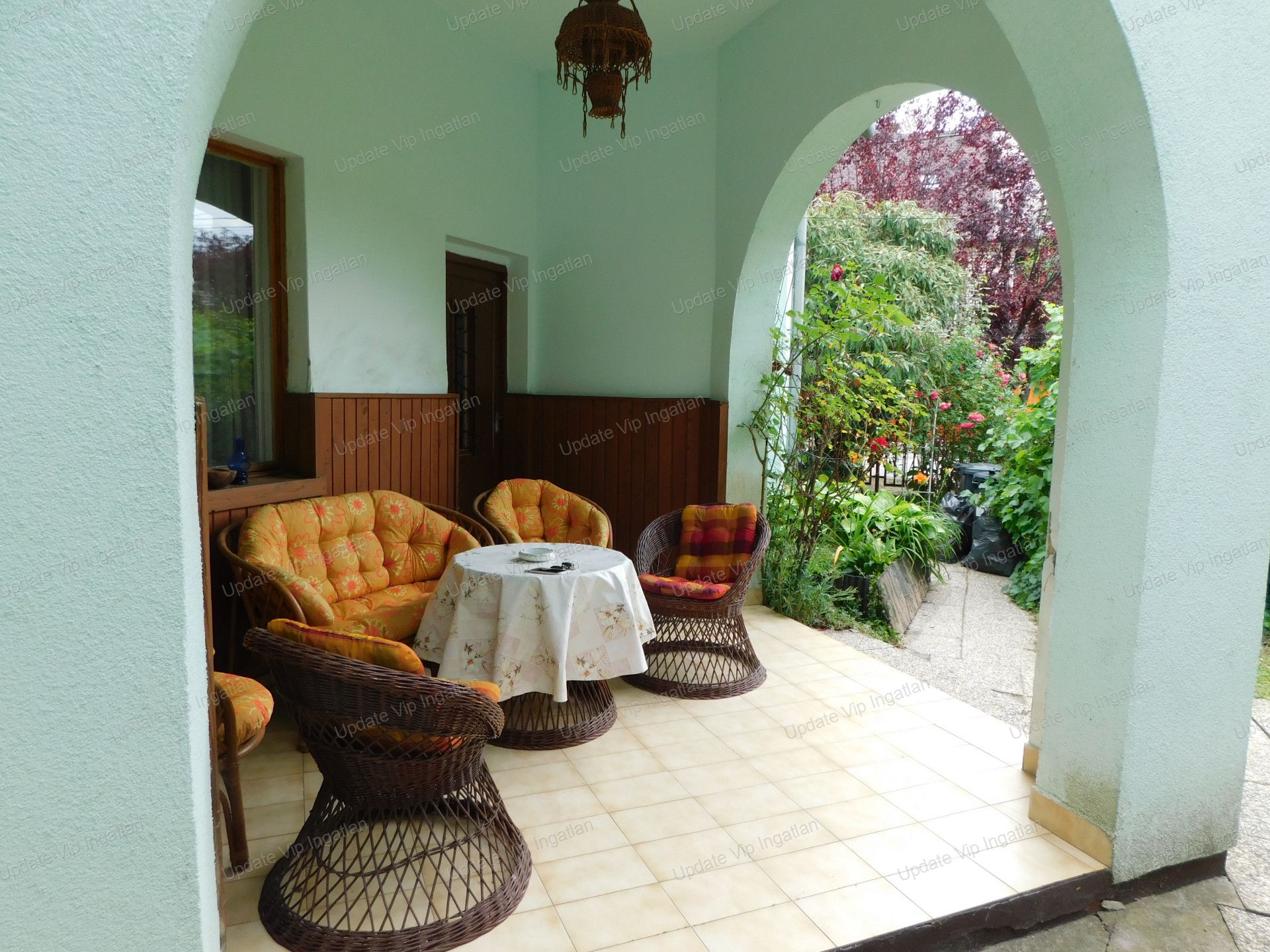 Rendezett udvar, virágokkal, szőlő lugassal bokrokkal, fákkal
