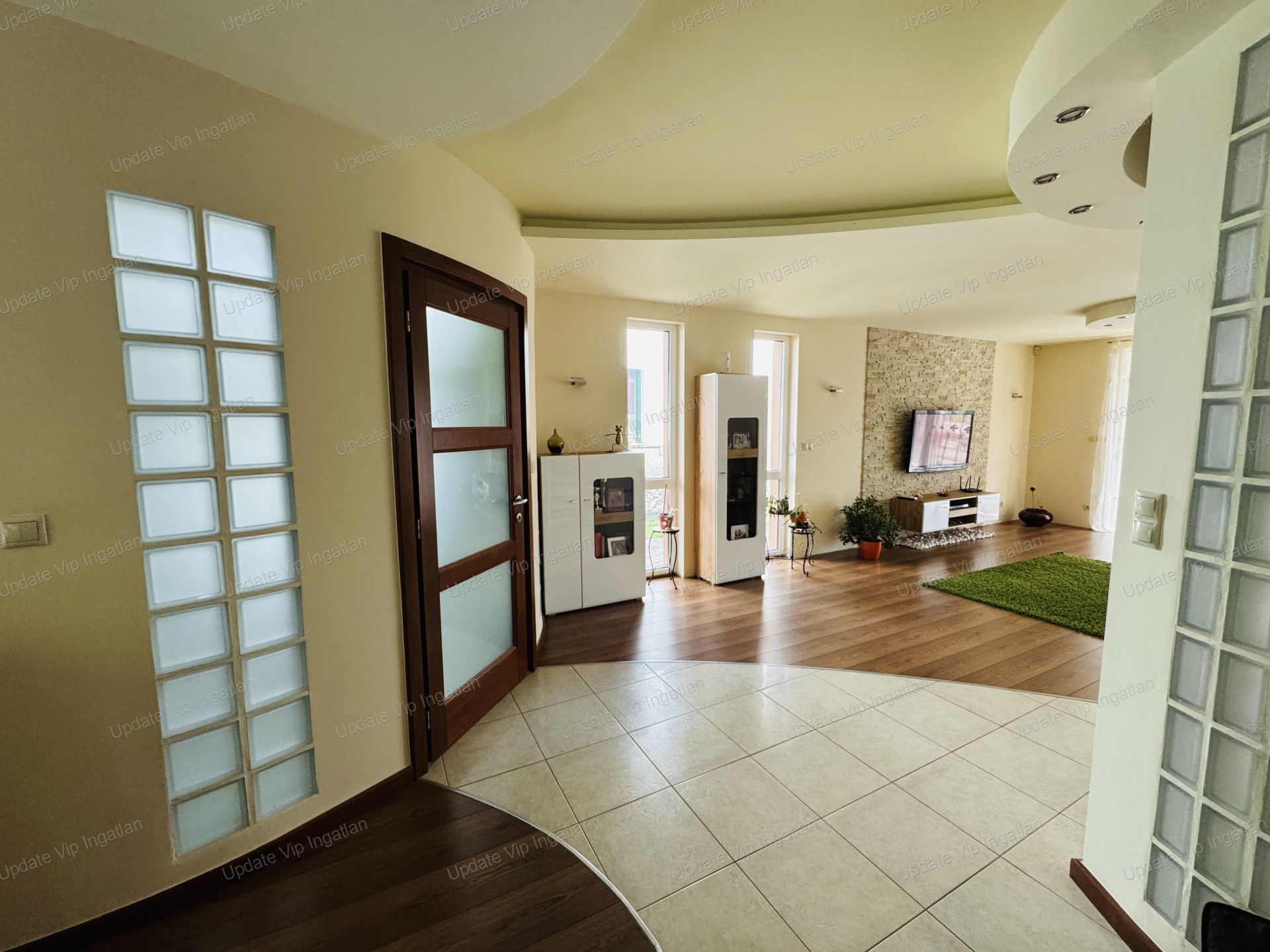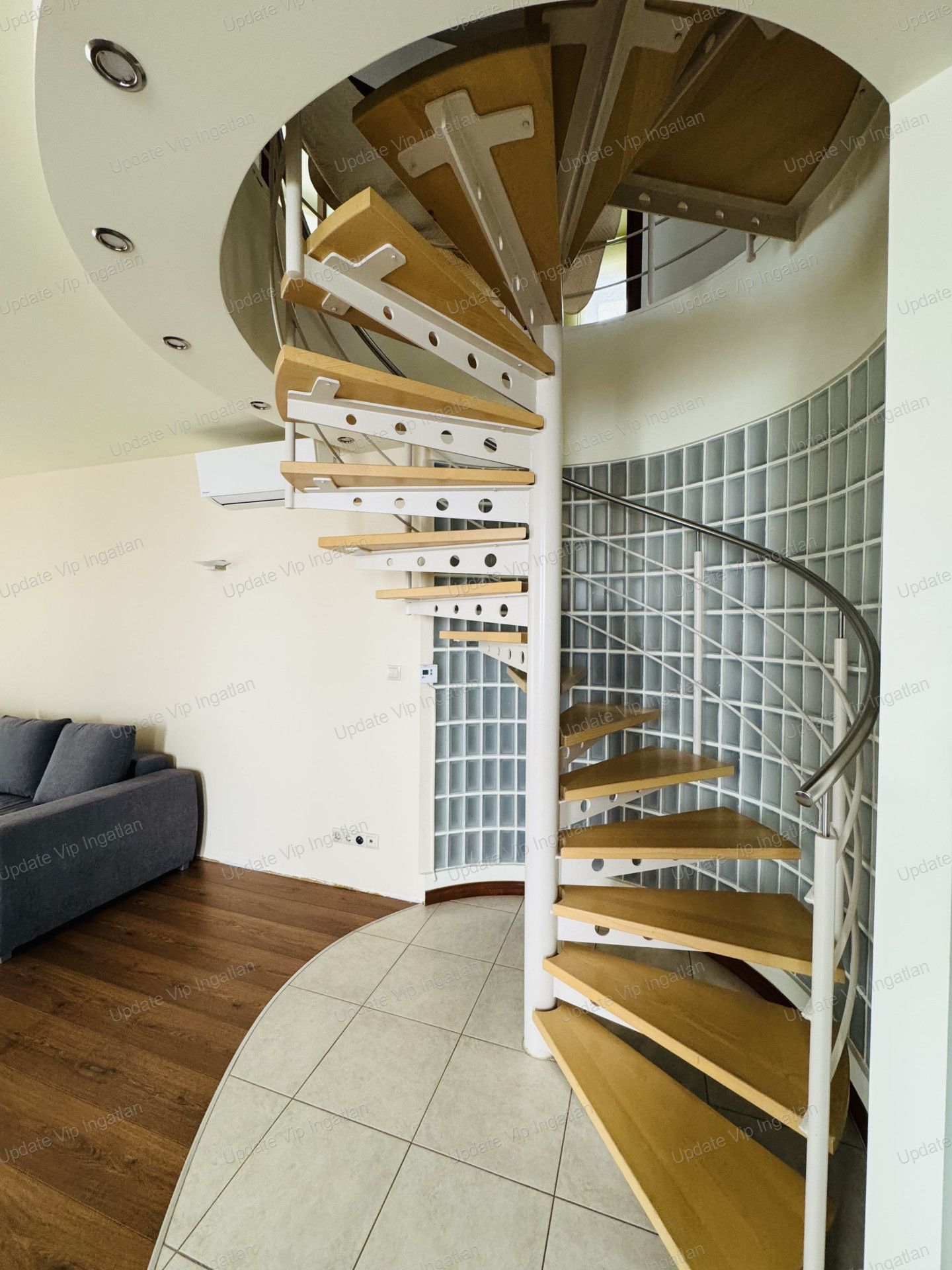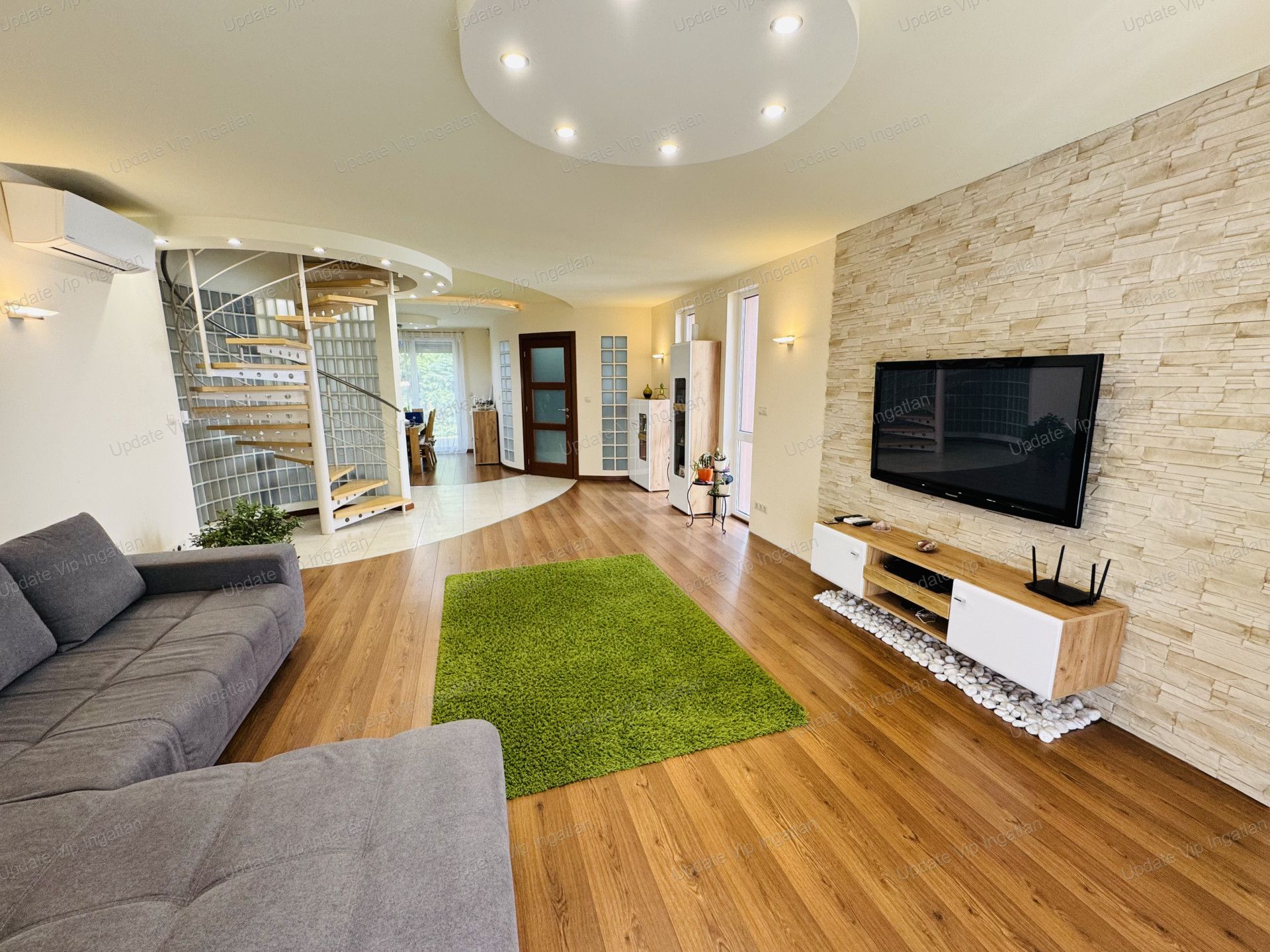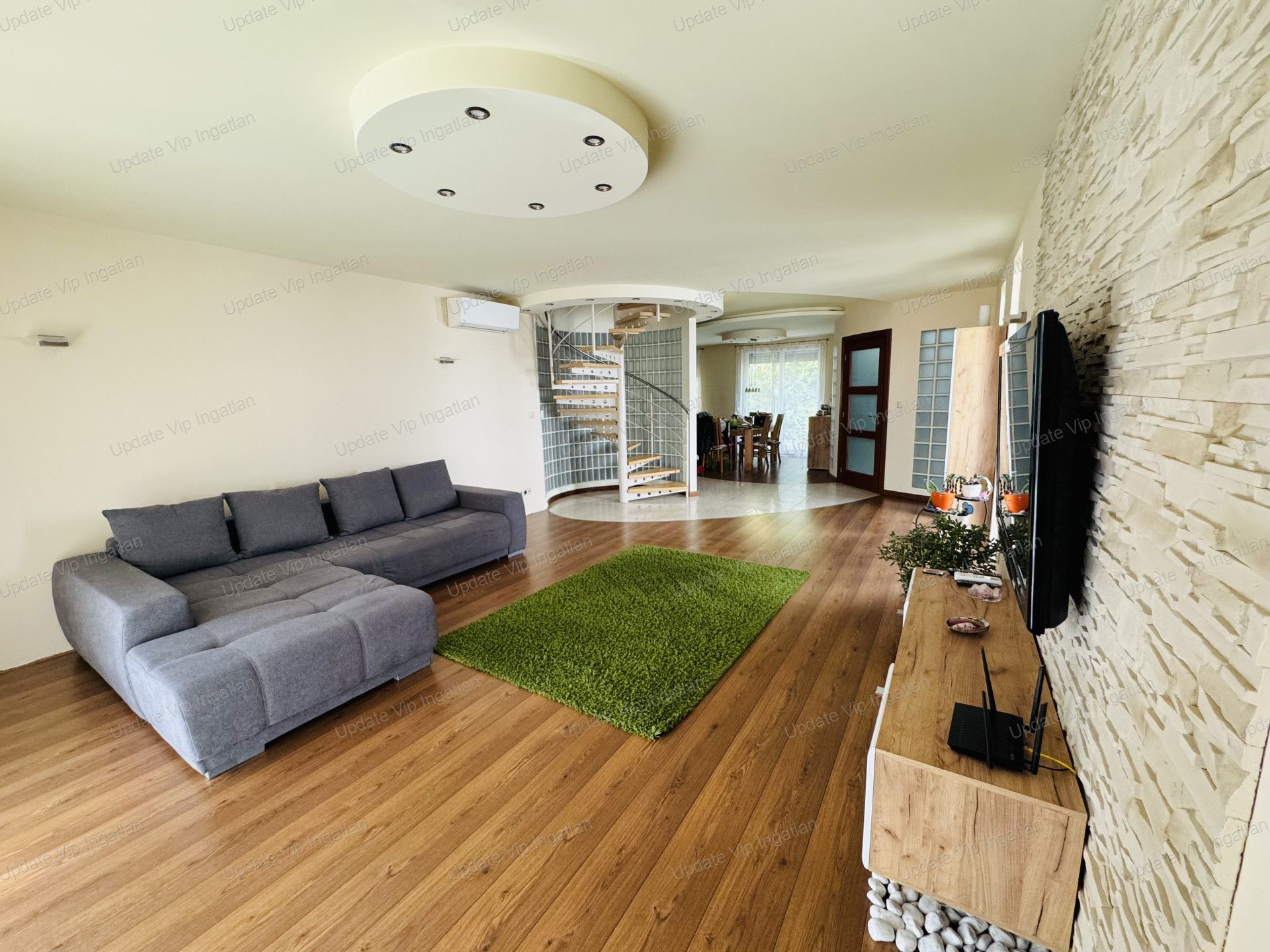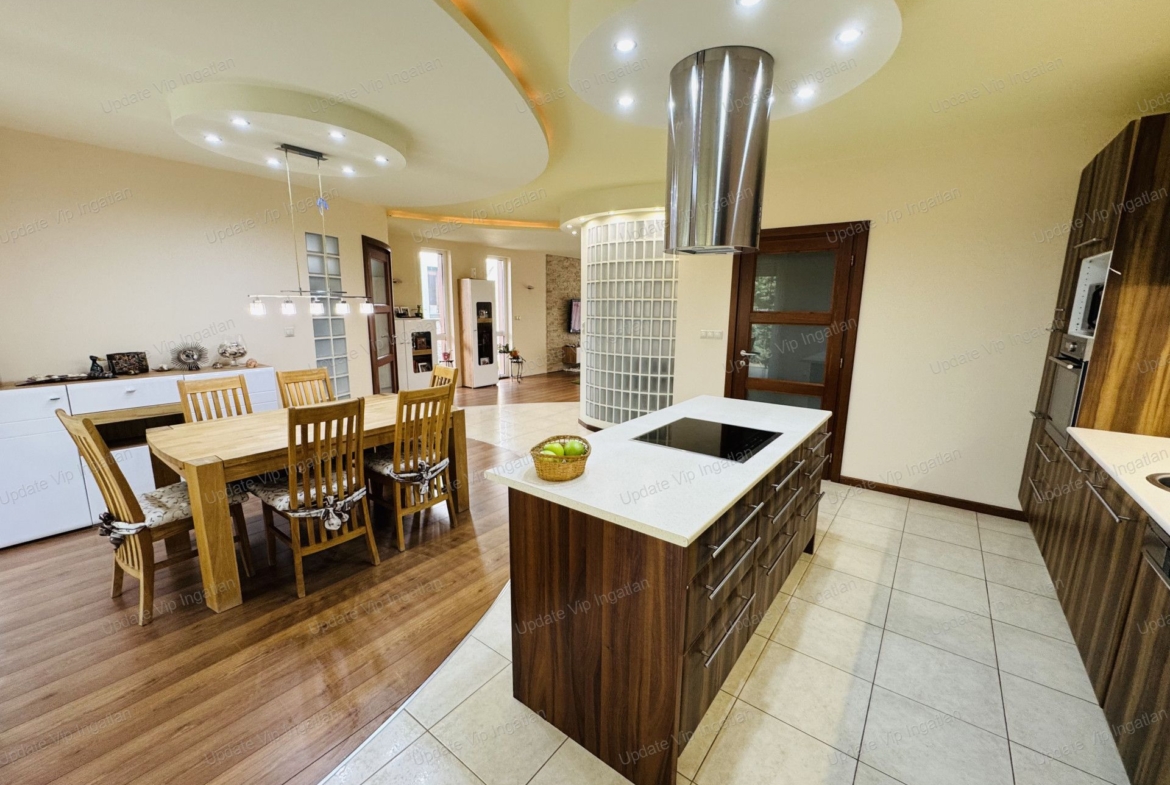 A ház egyik különleges hangulati eleme a nappaliban található, üvegtéglával körbevett csigalépcső, amely egyedi megjelenést kölcsönöz az ingatlannak. Az emeleti körfolyosó szintén egyedi kialakítású, amely tovább erősíti az otthon különleges karakterét.